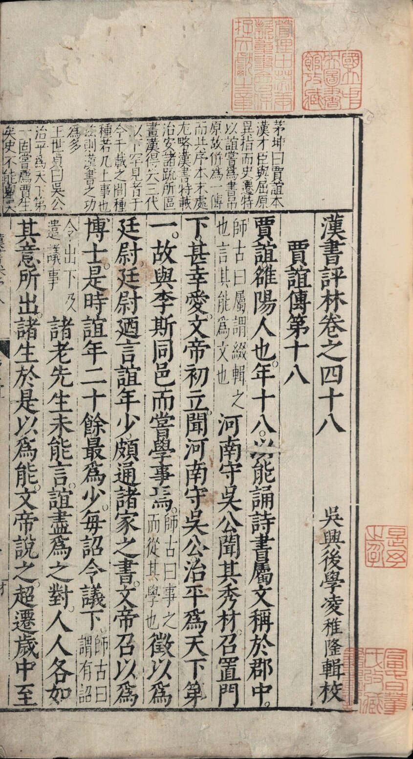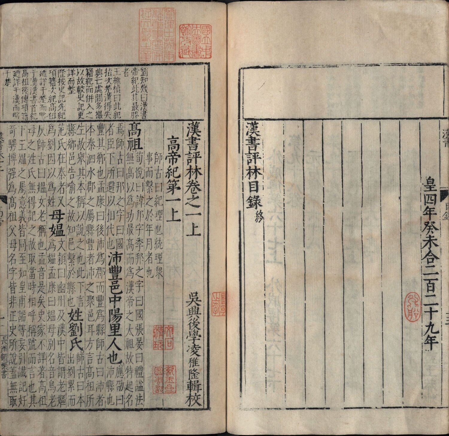 明万历十一年 [1] 台北国图/台北国图均著录为万历九年。根据书中最晚一篇序:〈漢書評林 序〉/明萬曆癸未春日五嶽山人沔陽陳文燭撰,修订为万历十一年。 @问书(癸未 1583) 吴兴凌氏刊本