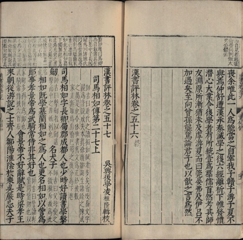 明万历时期凌稚隆在《史记评林》辑成之后,博搜群籍,并参考其父凌约言《汉书评抄》,收集各家对《汉书》的评点,撰成《汉书评林》。它汇集了东汉至明代 170 余家评论精粹,同时也蕴含着凌氏的个人见解,堪称有明一代《汉书》评点类书籍的集大成之作,为后世研究《汉书》提供有益的借鉴。