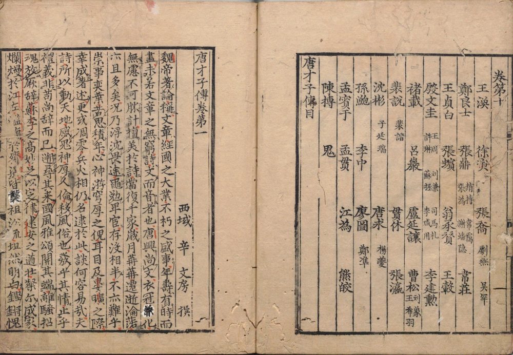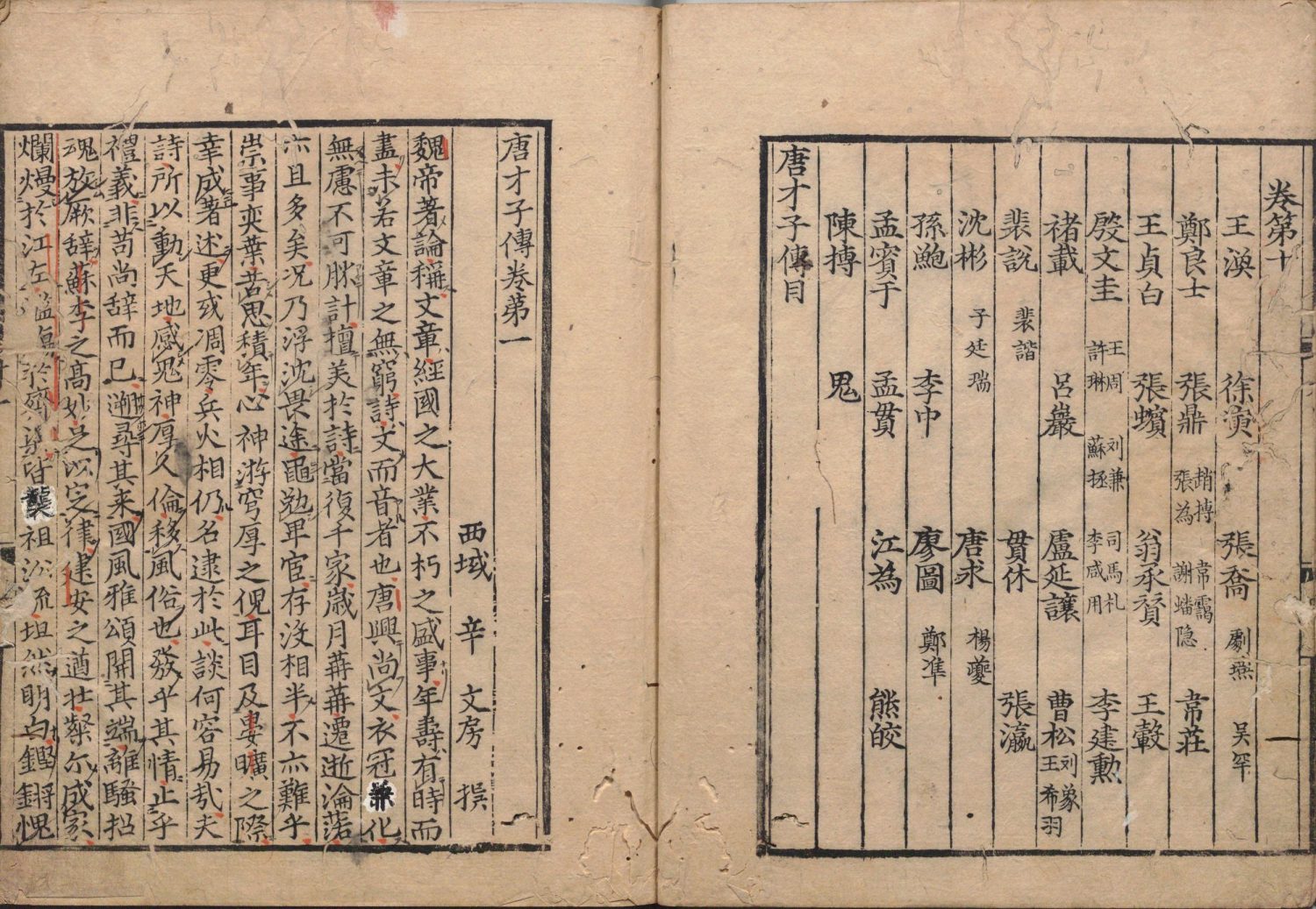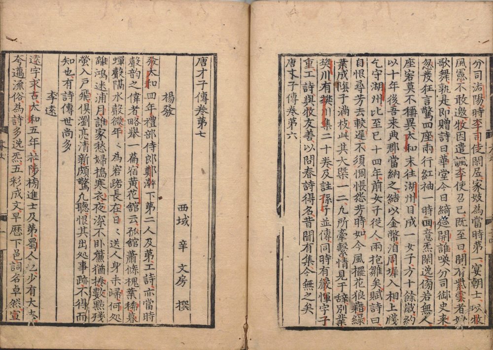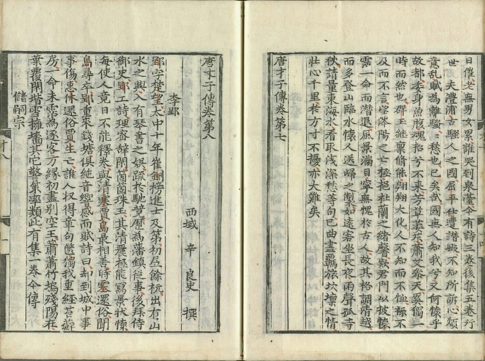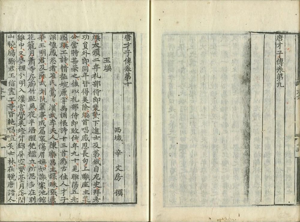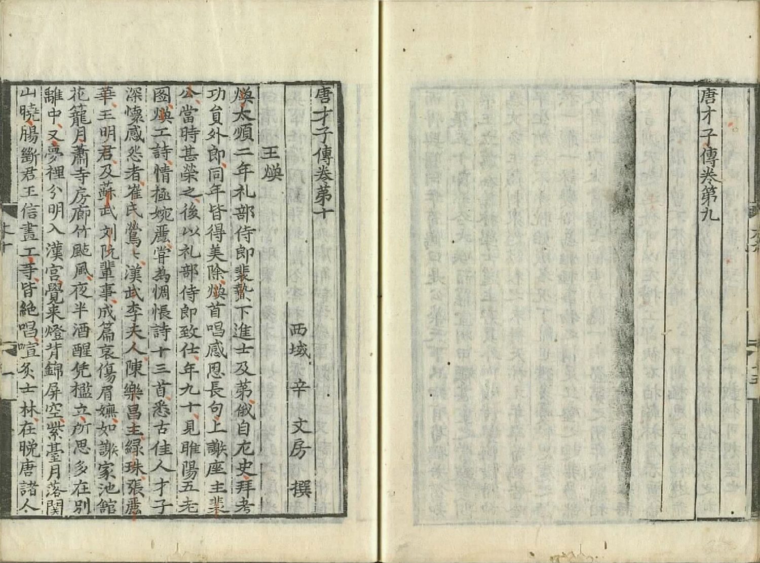 此《唐才子传》由元代西域人辛文房撰。全书共十卷,记载唐、五代诗人简要的评传二百七十八篇,传中又附一百二十人小传。书中保存了唐代诗人大量的生平资料﹐对其科举经历的记叙更为详备。清乾隆时期此书在中原已几乎亡佚。清光绪时期杨守敬从日本善慧轩访得五山本。此内含日本南北朝刊(五山版)两个藏本。