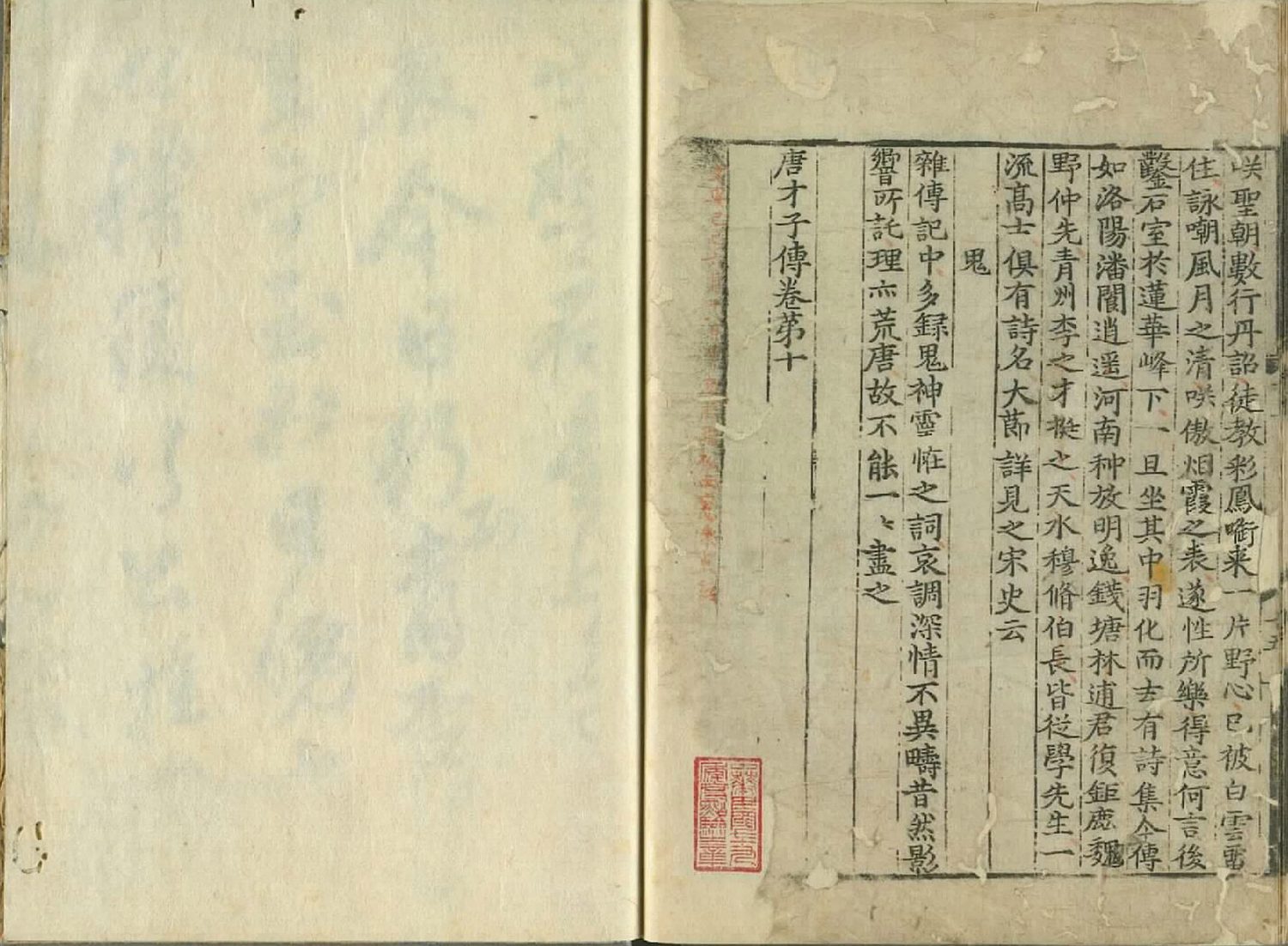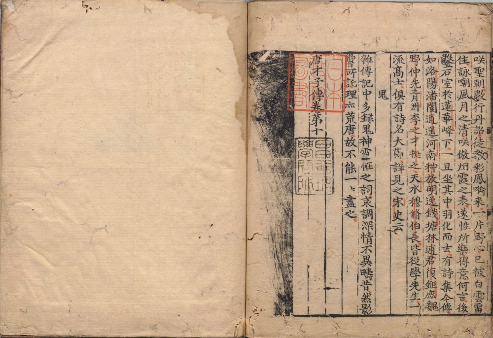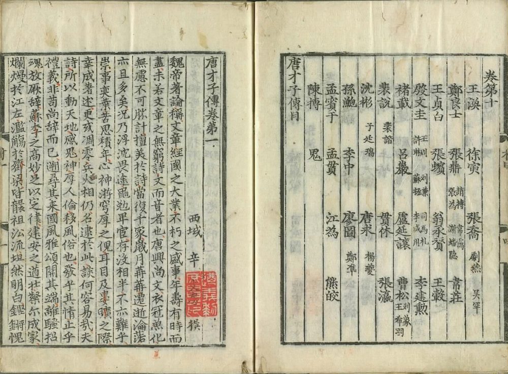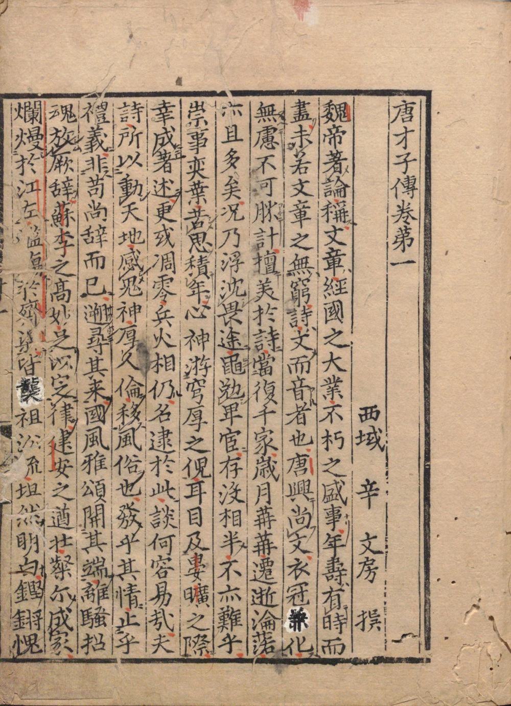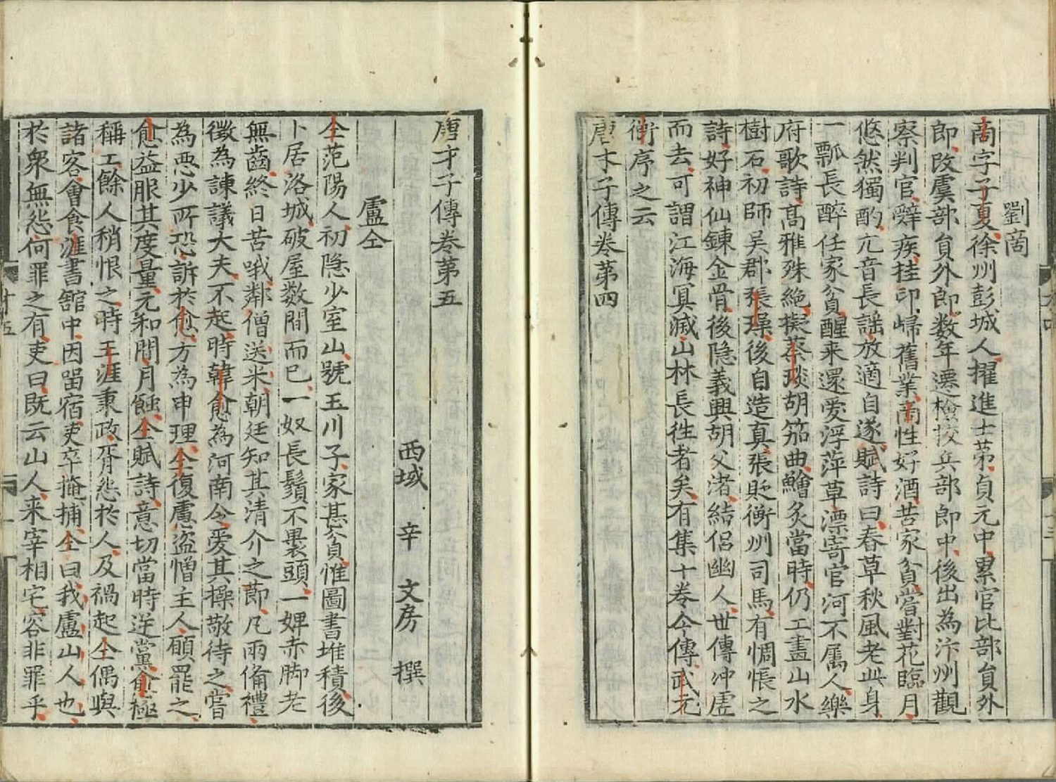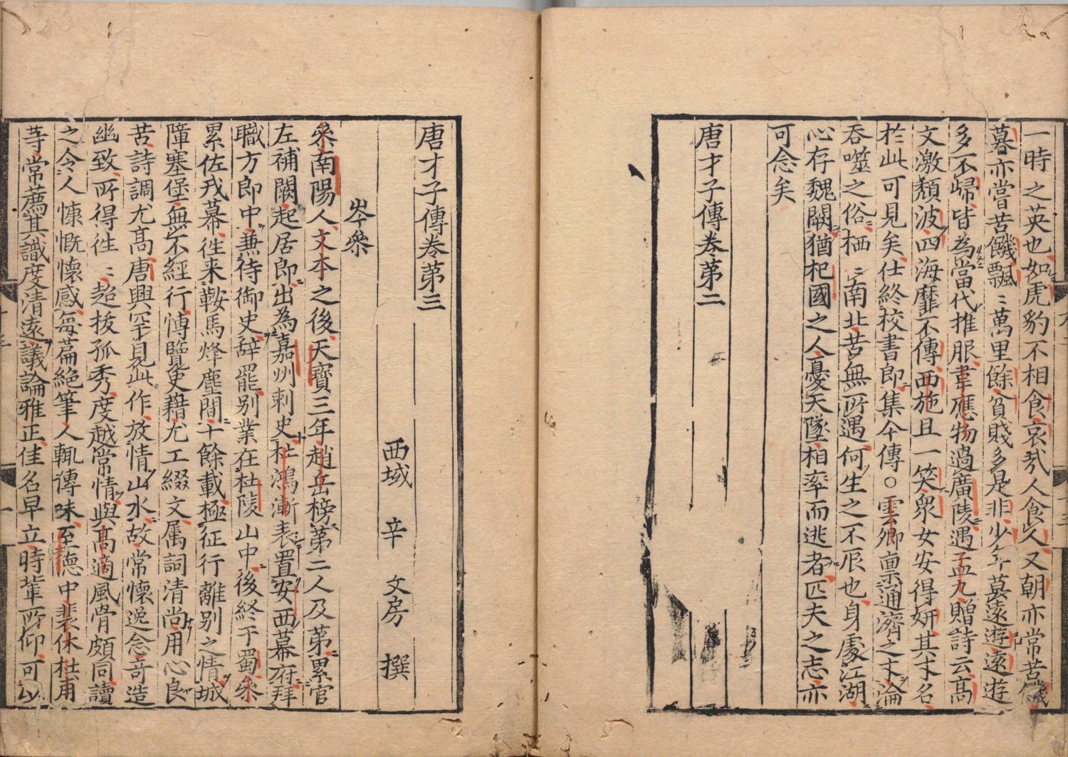 此《唐才子传》由元代西域人辛文房撰。全书共十卷,记载唐、五代诗人简要的评传二百七十八篇,传中又附一百二十人小传。书中保存了唐代诗人大量的生平资料﹐对其科举经历的记叙更为详备。清乾隆时期此书在中原已几乎亡佚。清光绪时期杨守敬从日本善慧轩访得五山本。此内含日本南北朝刊(五山版)两个藏本。